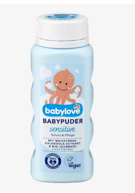 Дитяча присипка babylove для чутливої шкіри ніжно доглядає та захищає ніжну шкіру малюка. М’яка формула з натуральними інгредієнтами, такими як кукурудзяний крохмаль, екстракт календули та органічна олія жожоба, надійно поглинає вологу та допомагає запобігти подразненню шкіри. Присипка не містить ароматизаторів та ідеально підходить для щоденного догляду з народження. Завдяки захисту від дітей, продукт залишається безпечним у використанні. Для м’якої та захищеної шкіри малюка.