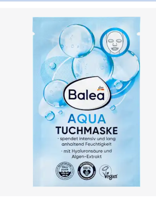 Тканина-маска Balea Aqua містить формулу з гідрокомплексом гліцерину та пантенолу. Вона забезпечує шкіру негайним та інтенсивним зволоженням – до 24 годин.* Гіалуронова кислота зв’язує вологу та наповнює шкіру зсередини. Дрібні зморшки розгладжуються.** Безмасляна формула з екстрактом водоростей залишає шкіру свіжою та сяючою. Формула без мікропластику та водорозчинних, повністю синтетичних полімерів.