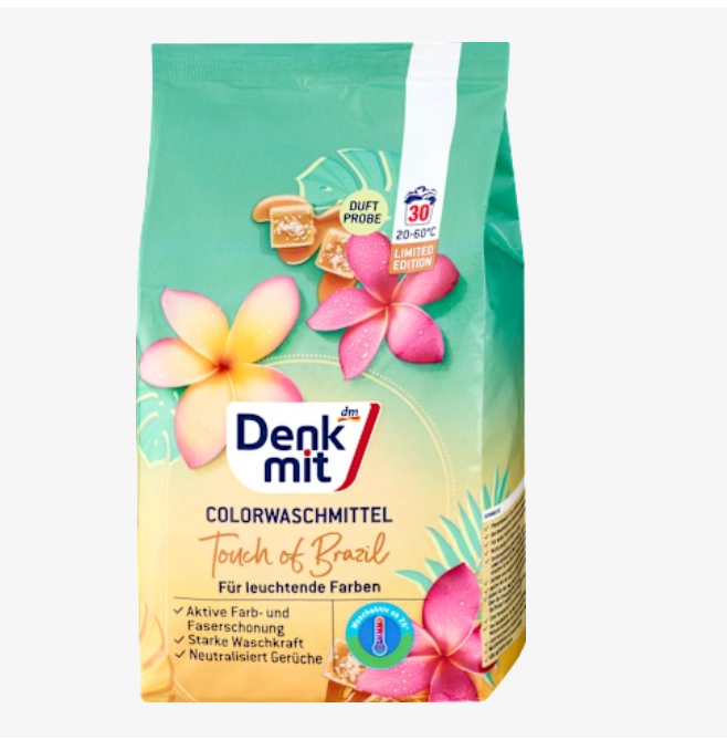 З екзотичним ароматом, пральний порошок для кольорової білизни Denkmit Touch of Brazil балує почуття з кожним пранням. Його потужна формула глибоко очищає кольорову білизну та надійно захищає кольори від вицвітання завдяки активному захисту кольору та волокон. Неприємні запахи ефективно нейтралізуються. Засіб розкриває свою повну очищувальну здатність навіть за 20°C, що забезпечує енергозберігаюче прання. Для блискуче чистої білизни та відчуття тривалої свіжості з особливим дотиком.