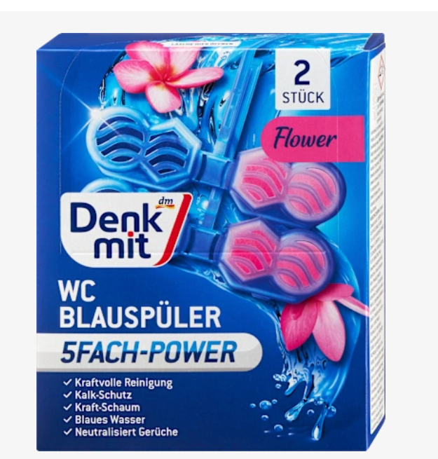 Завдяки змиву для унітазу Flower Blue від Denkmit ваша ванна кімната буде гігієнічно чистою та свіжою з кожним змиванням. Інноваційна технологія 5-кратної потужності забезпечує ретельне очищення, захищає від утворення вапняного та сечового нальоту, а також залишає тривалий, свіжий квітковий аромат. Блакитна вода не лише сигналізує про чистоту, але й нейтралізує неприємні запахи. Надійний помічник для добре доглянутого туалету.
