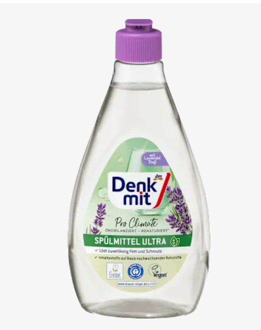 Засіб для миття посуду Denkmit ultra Pro Climate Lavender надійно розчиняє жир та бруд. Він вражає інгредієнтами на основі відновлюваних ресурсів. Для легко забрудненого посуду достатньо від двох мілілітрів до п’яти літрів води. Для сильно забрудненого посуду достатньо від трьох мілілітрів до п’яти літрів води. Засіб для миття посуду також зачаровує ніжним ароматом лаванди.
